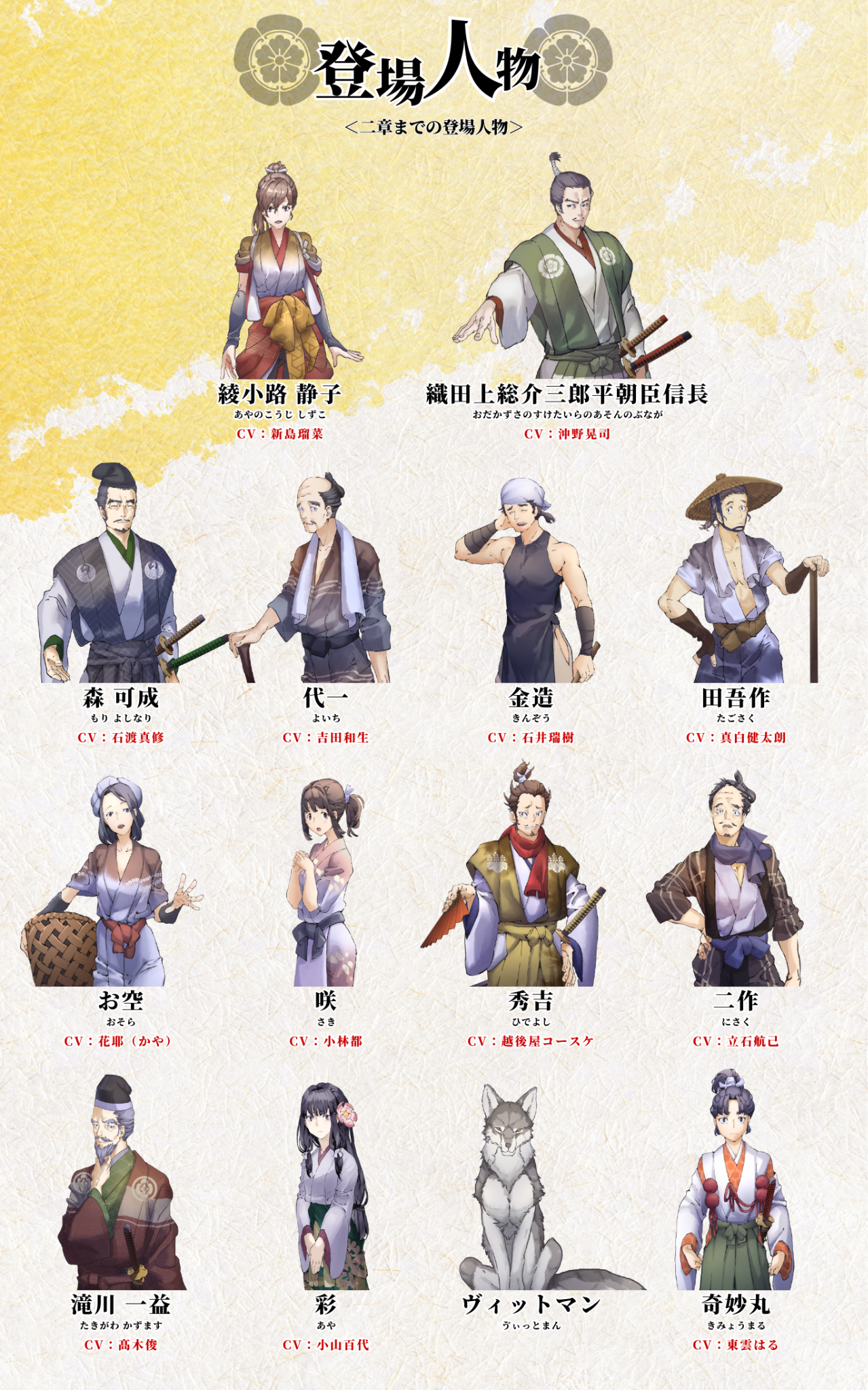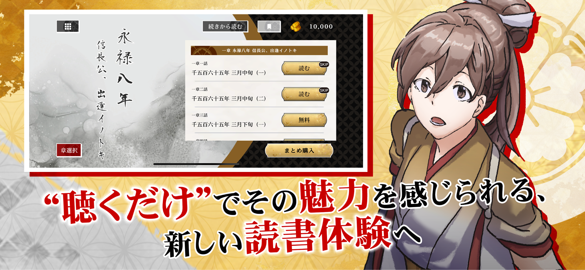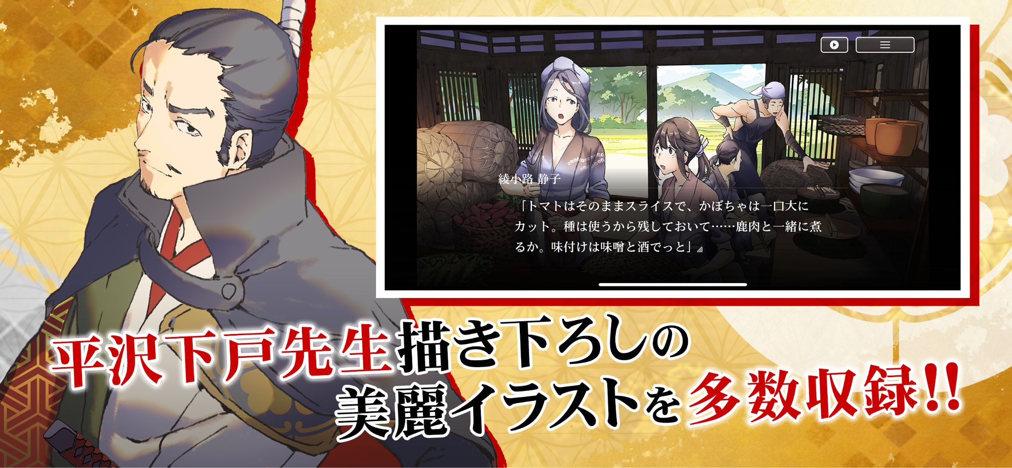 本アプリは物語を1話ずつ購入して読み進めるフルボイス・ヴィジュアルノベルアプリで、第1章の第1話〜第8話まで無料でお楽しみいただけます。まずはアプリを手に取り、静子とともに戦国の世界へ足を踏み入れてみてください。