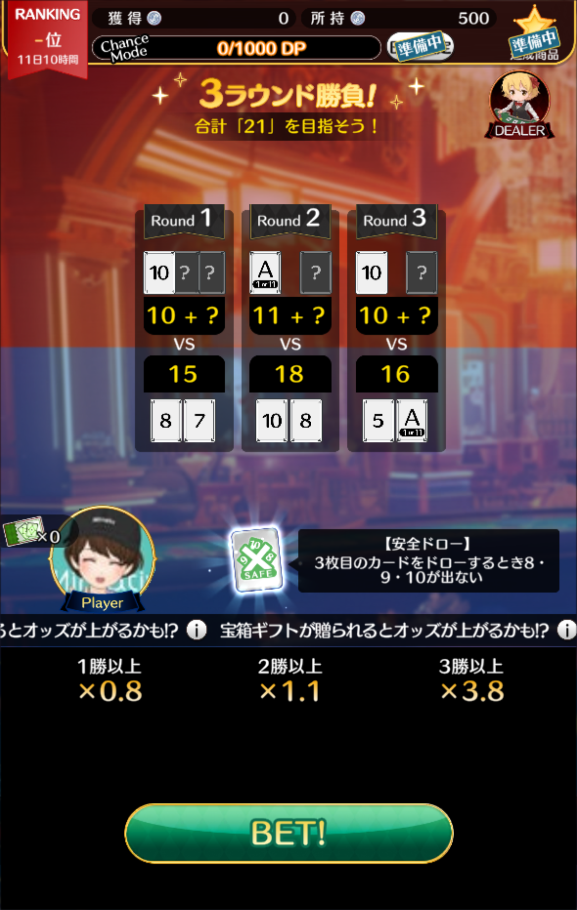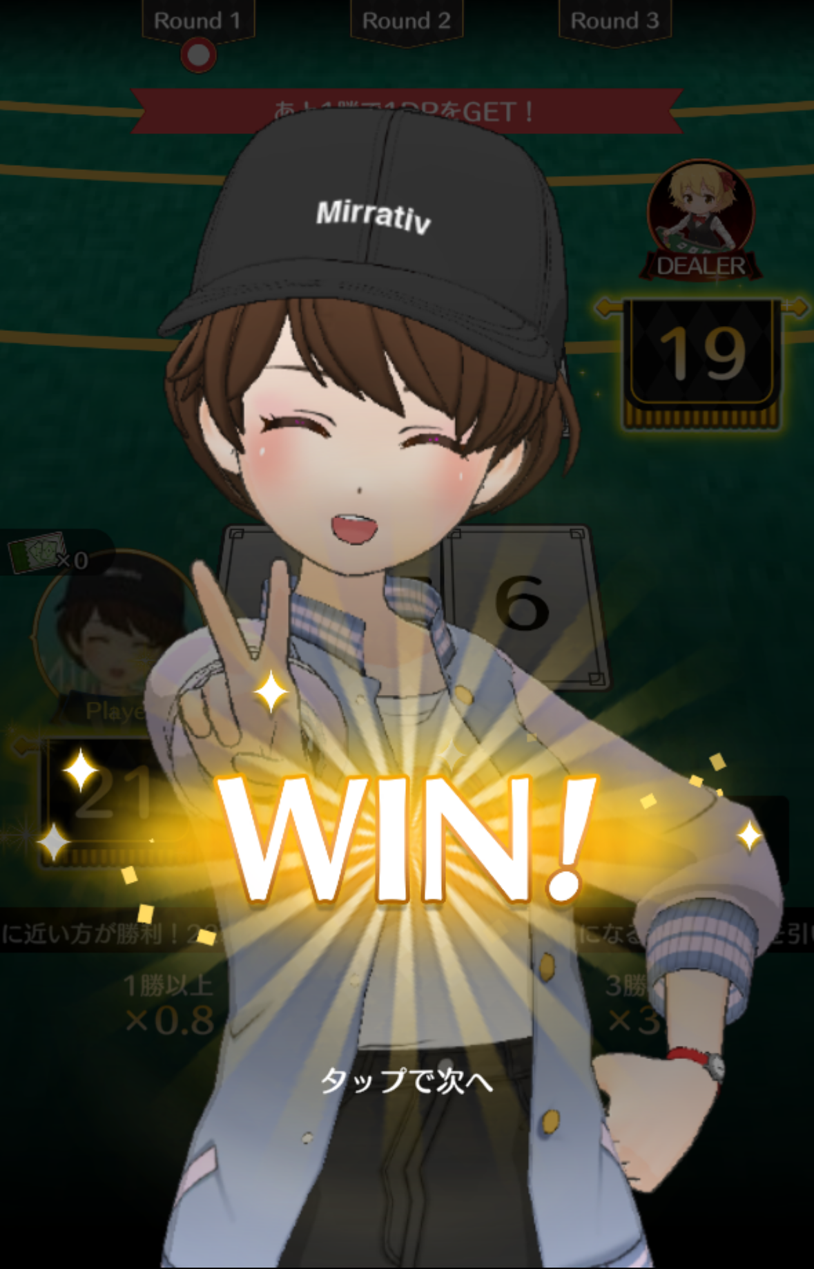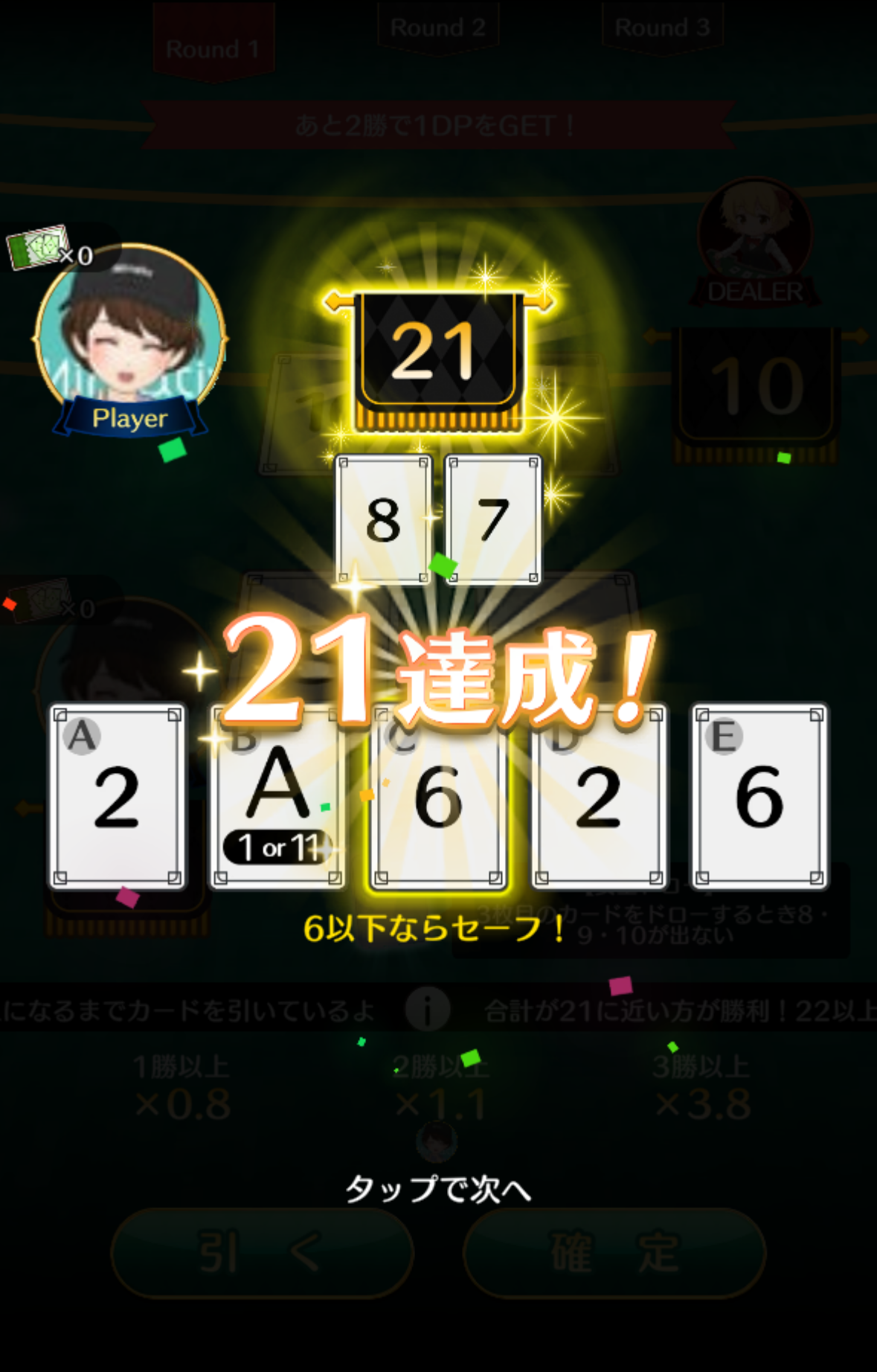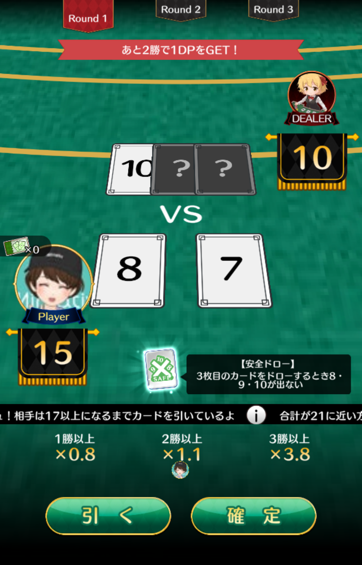 本タイトルは、配信者とディーラーが互いにカードを引いて「合計値をより21に近づけた方が勝利」となるライブゲームです。
